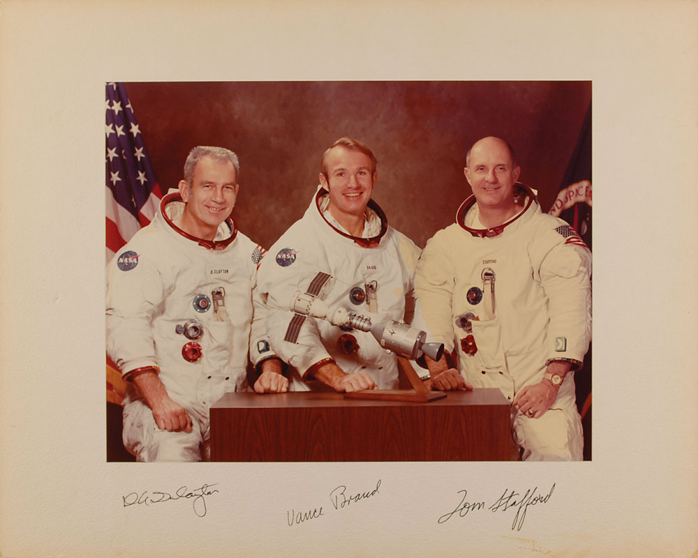 Color 13.5 x 10.75 photo of the American astronauts of the Apollo-Soyuz mission posing in their space suits with a model of the docked capsules, affixed to its original 20 x 16 mount, signed on the mount in black ink by Deke Slayton, Vance Brand, and Tom Stafford. In fine condition, with some mild toning to mount. Pre-certified Steve Zarelli and RR Auction COA.