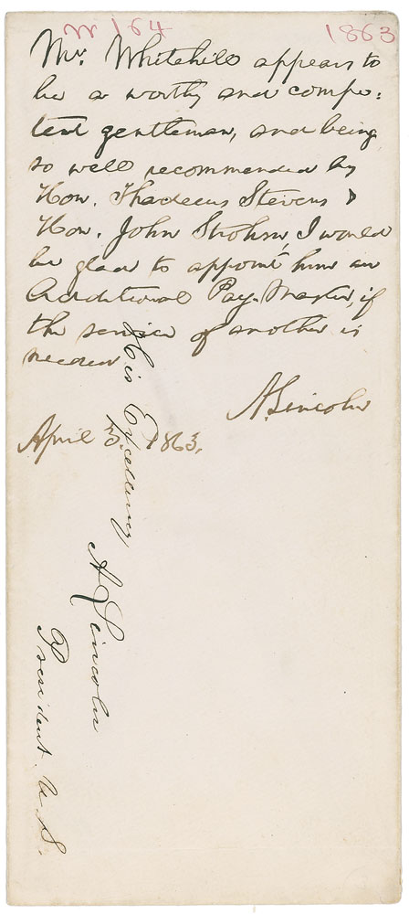 Handwritten endorsement, as president, signed “A. Lincoln,” dated April 3, 1863, written vertically on an off-white 8.25 x 3.5 mailing envelope, addressed in an unknown hand to Lincoln, “His Excellency, A. Lincoln, President U.S.” Lincoln writes, in full: “Mr. Whitehill appears to be a worthy and competent gentleman, and being so well recommended by Hon. Thadeus [sic] Stevens & Hon. John Strohm, I would be glad to appoint him an Additional Pay Master, if the service of another is needed.” A couple ink notations along top edge, a horizontal fold near bottom, endorsement over a small portion of address, and a bit of scattered light soiling, otherwise fine condition. Accompanied by an engraved portrait of Lincoln, and a clipped label from Goodspeed’s Book Shop in Boston, having been previously framed by them.
