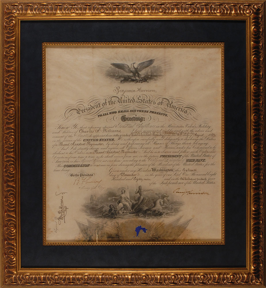 Partly-printed DS as president, signed “Benj Harrison,” one page, 14 x 15.5, December 16, 1889. President Harrison appoints Charles S. Williams “to the grade of Passed Assistant Paymaster with the relative rank of Lieutenant Junior grade.” Signed at the conclusion by Harrison and countersigned by Secretary of the Navy Benjamin Tracy. Nicely matted and framed to an overall size of 21.75 x 23.5. In very good condition, with intersecting folds, scattered toning and foxing, heavier along bottom, and a removed and missing seal. Oversized. Pre-certified John Reznikoff/PSA/DNA and RR Auction COA.