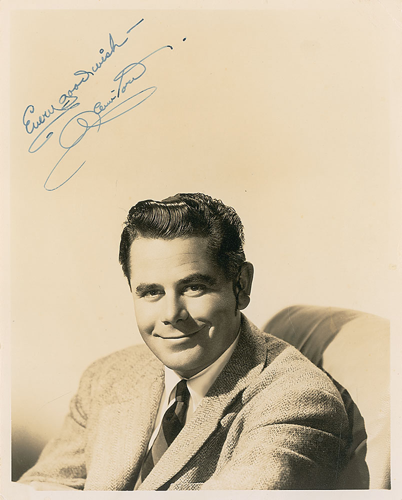 Vintage matte-finish 8 x 10 photo of Ford in a chair, signed in fountain pen, “Every good wish, Glenn Ford.” A few scattered creases, a bit of light spotting, and some light silvering to darker areas of image, otherwise fine condition. Pre-certified PSA/DNA and RR Auction COA.
