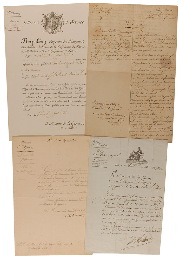 Four items, all in French: LS, signed by Alexandre Berthier, one page, October 3, 1803, naming Citizen Dequercy a Master Sargeant; DS, signed by Henri Clarke “Duc de Feltre,” dated July 12, 1812, appointing Battalion Chief Denis de Trobriand to the General Staff of the Grande Armee; DS, signed by Charles Francois Dumouriez, dated December 16, 1792, requesting the re-entry into service of Antoine Delbos, Sergeant Major of the 49th Regiment. Dumouriez signs and sends back to the Minister of War. Also signed by the Administrators of the city of Le Quesnoy; and LS from Nicholas Soult, “Mal (Marshal) Duc de Dalmatie,” March 30, 1831. A letter to General Jean Antoine Dejean informing him that the King has appointed him to the reserve corps of the General Staff. In overall very good to fine condition. RR Auction COA.