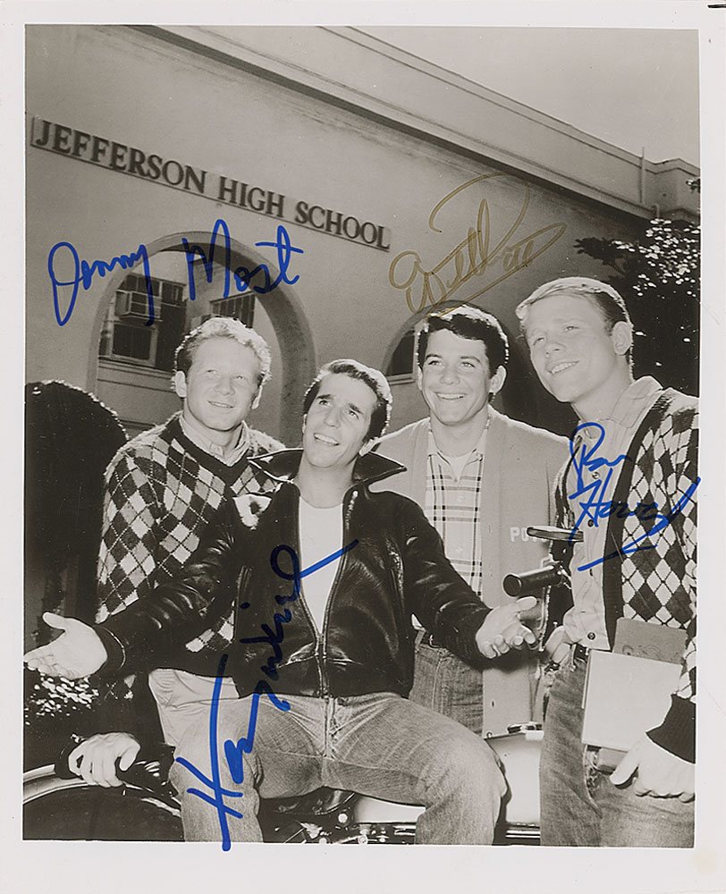 Glossy 8 x 10 cast photo, signed in blue and black felt tip by Henry Winkler, Ron Howard, Donny Most, and Anson Williams. A few creases to corners and borders, and Williams’s signature moderately faded, otherwise fine condition. Pre-certified PSA/DNA and RR Auction COA.