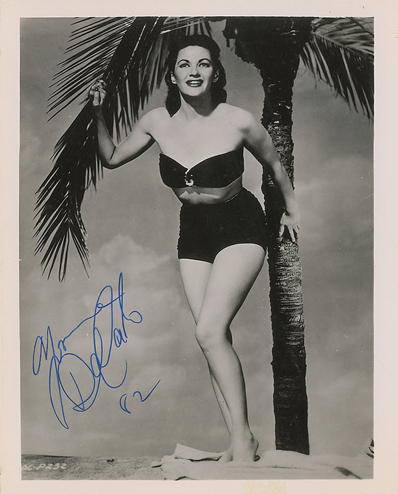Glossy 8 x 10 photo of the actress in a bathing suit, signed in blue felt tip. In very good condition, with light scattered creases, a small tear to the left border, and a few dings to the edges. Pre-certified PSA/DNA and RR Auction COA.