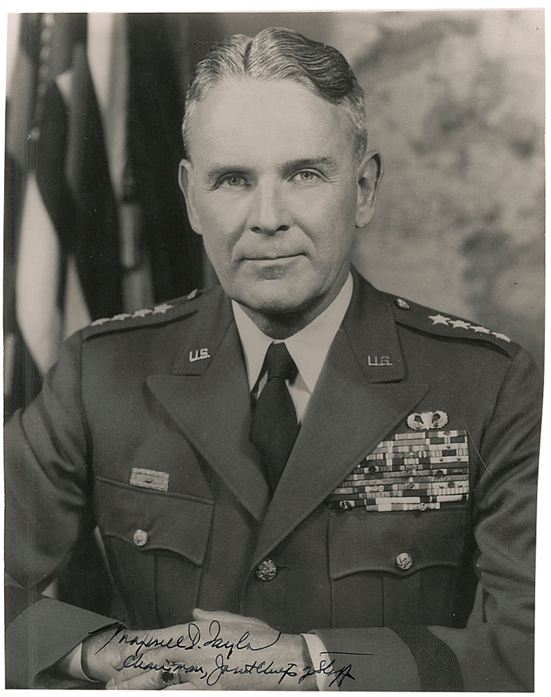 Vintage glossy 7.5 x 9.5 photo of Taylor in uniform, signed in fountain pen, “Maxwell D. Taylor, Chairman, Joint Chiefs of Staff.” In fine condition, with a few light creases and lightly trimmed edges. RR Auction COA.