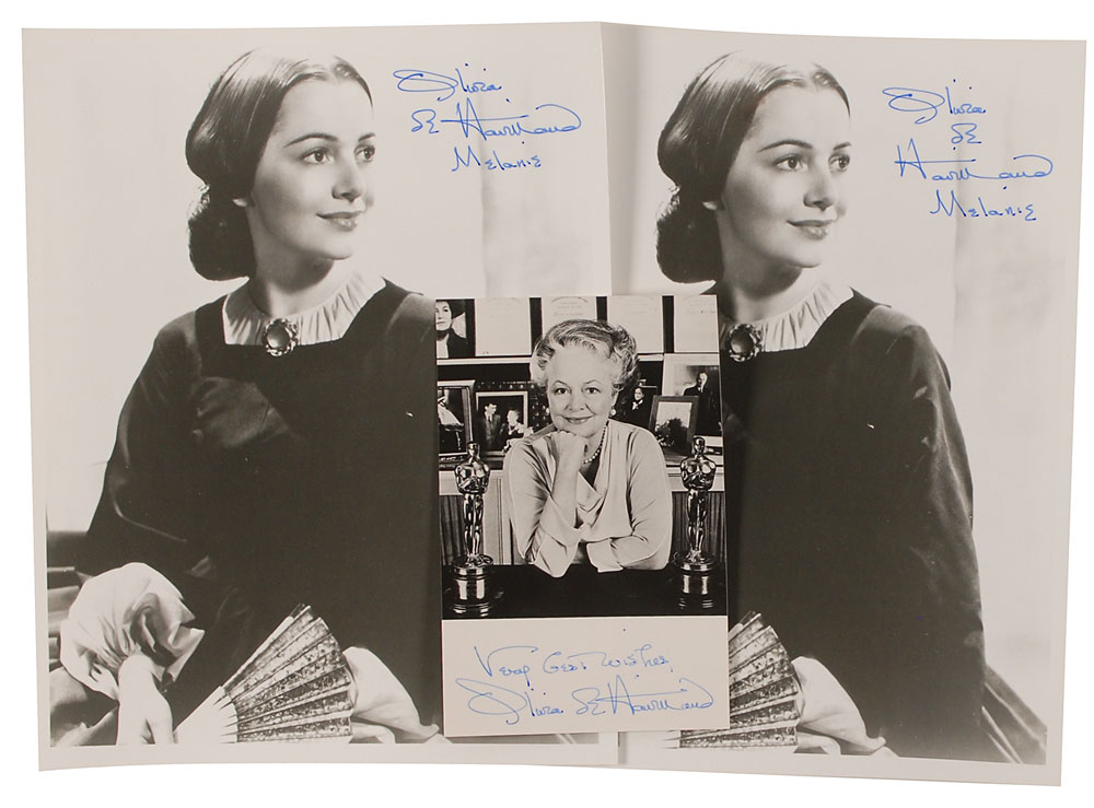 Three signed photos: two glossy 8 x 10 photos of de Havilland as Melanie from Gone With the Wind, each signed in blue felt tip, “Olivia de Havilland, Melanie”; and a glossy 3.75 x 5.75 photo of an older de Havilland, signed in the lower border in blue felt tip. In fine condition. RR Auction COA.