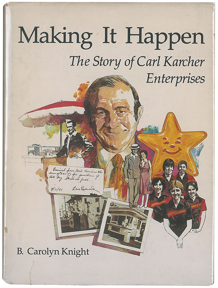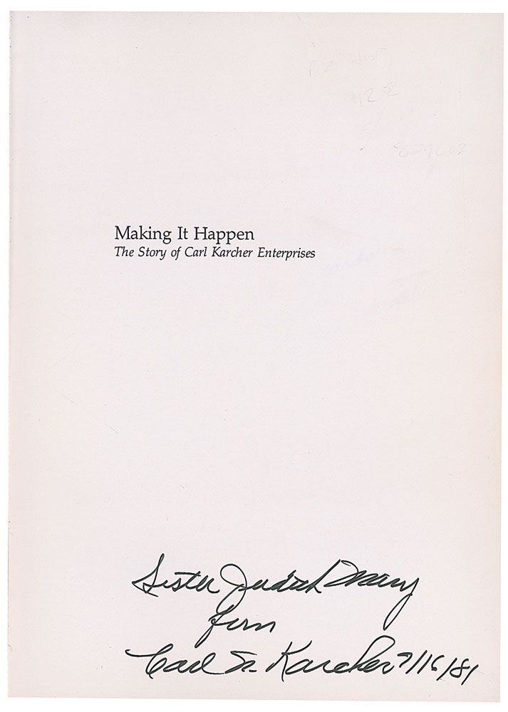 Signed book: Making It Happen. Anaheim, California: Carl Karcher Enterprises, 1981. Hardcover with dust jacket, 7.75 x 10.25, 143 pages. Signed and inscribed on the half-title page, “Sister Judith Mary from Carl N. Karcher 7/16/81.” Some pencil notations to family tree in back of the book, and a few tears and toning to dust jacket, otherwise fine condition. RR Auction COA.