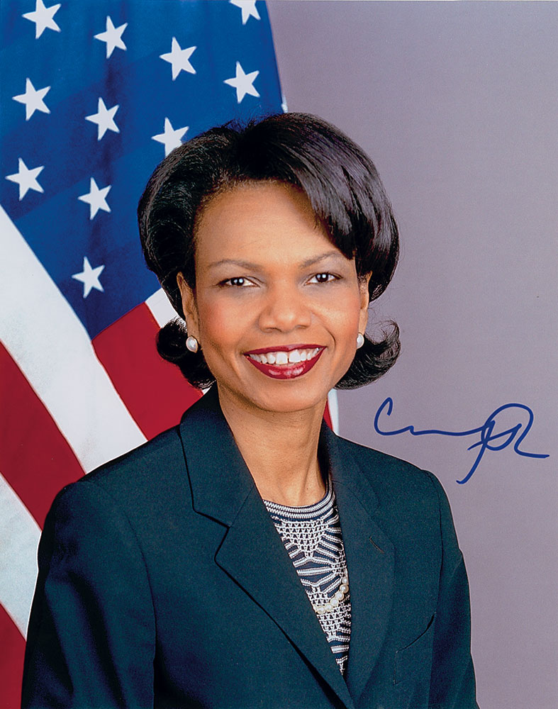 Color satin-finish 11 x 14 photo of Rice posing in front of the American flag, signed in blue felt tip. In fine condition. RR Auction COA.
