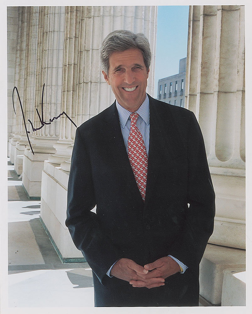 Two photos: a satin-finish 8 x 10 portrait of Kerry posing outdoors, and a glossy 10 x 8 of Kerry addressing a crowd during a campaign stop, each signed in black felt tip. In fine condition. RR Auction COA.
