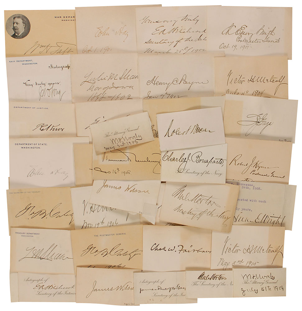 White House card, 4 x 2.75, signed in black ink, “Theodore Roosevelt.” In very good condition, scattered toning and soiling, moderate rippling, and mounting remnants to reverse. Accompanied by 36 slips and cards, each signed by a member of his cabinet. Signers are: William H. Taft (2), Elihu Root (2), John M. Hay (2), Lyman J. Gage, Leslie M. Shaw (2), Philander C. Knox, James Wilson (2), William H. Moody (2), George B. Cortelyou (2), Charles W. Fairbanks, Victor H. Metcalf (3), Paul Morton (2), Charles J. Bonaparte (2), Luke E. Wright, James Rudolph Garfield, Oscar S. Straus, George von L. Meyer, Robert J. Wynne, Ethan A. Hitchcock (2), Charles E. Smith, John D. Long, Truman H. Newberry, Robert Bacon, and Henry C. Payne. Scattered toning, soiling, and rippling, otherwise overall fine condition. RR Auction COA.