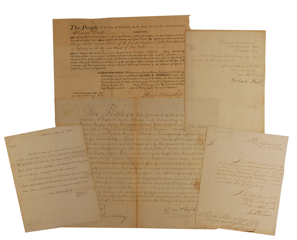 Six letters and documents, each signed by a member of Monroe’s cabinet. Signers are: Richard Rush, Smith Thompson, Daniel D. Tompkins (2), and William Wirt. In overall very good to fine condition, with various folds, toning, slight paper loss, and pencil notations. RR Auction COA.