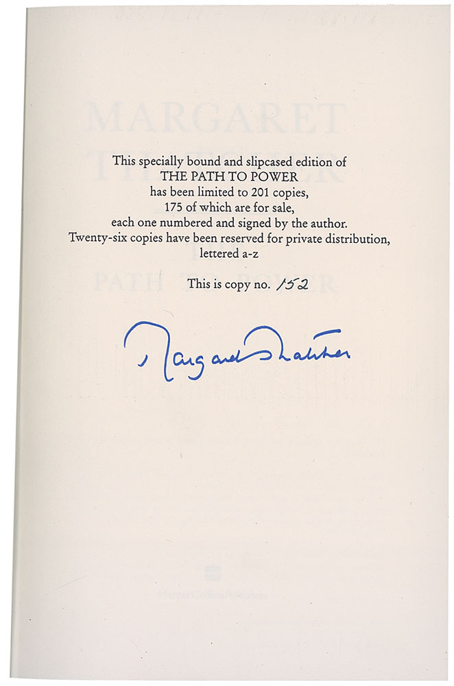 Signed book: Path to Power. Limited first US edition of 201 copies (this being No. 152). NY: HarperCollins, 1995. Hardcover with slipcase, 6.5 x 9.25, 656 pages. Signed on the colophon in blue ink. In fine condition, with a couple trivial spots to front cover. RR Auction COA.