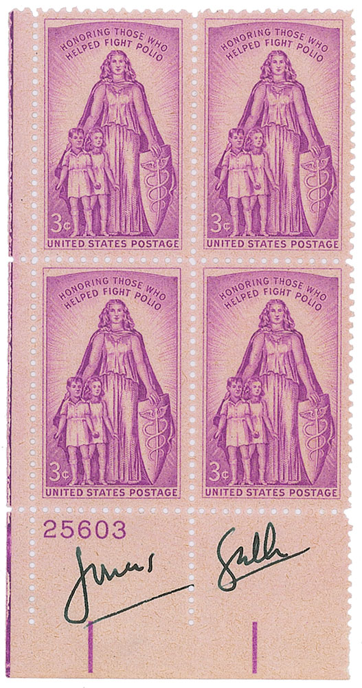 Block of four US postage stamps honoring those who helped fight polio, 2.25 x 4, signed in the lower border in black ink. In fine condition. RR Auction COA.