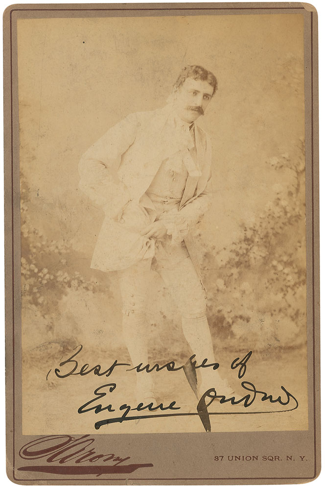 American baritone (1858–1894) who sang the part of the Templar Brian de Bois Guilbert in Sir Arthur Sullivan's grand opera, Ivanhoe. Original 4.25 x 6.5 full-length cabinet photo by Sarony, signed at the bottom of the image in fountain pen, “Best wishes of Eugene Oudin.” A few corner creases and edge dings, image a bit faded, and pencil notations to reverse, otherwise fine condition. RR Auction COA.