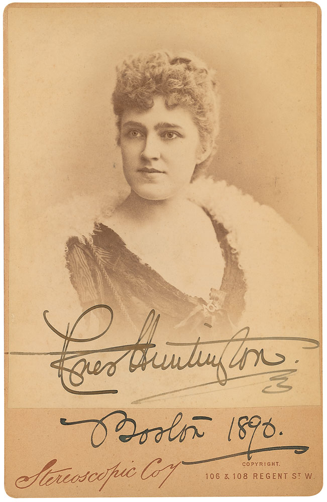Soprano best known for her work in comic opera. Original 4.25 x 6.5 cabinet photo by the London Stereoscopic Company, signed at the bottom of the image in black ink, “Agnes Huntington, Boston 1890.” In fine condition, with a few light spots and surface marks to image and mild toning to lower border. RR Auction COA.