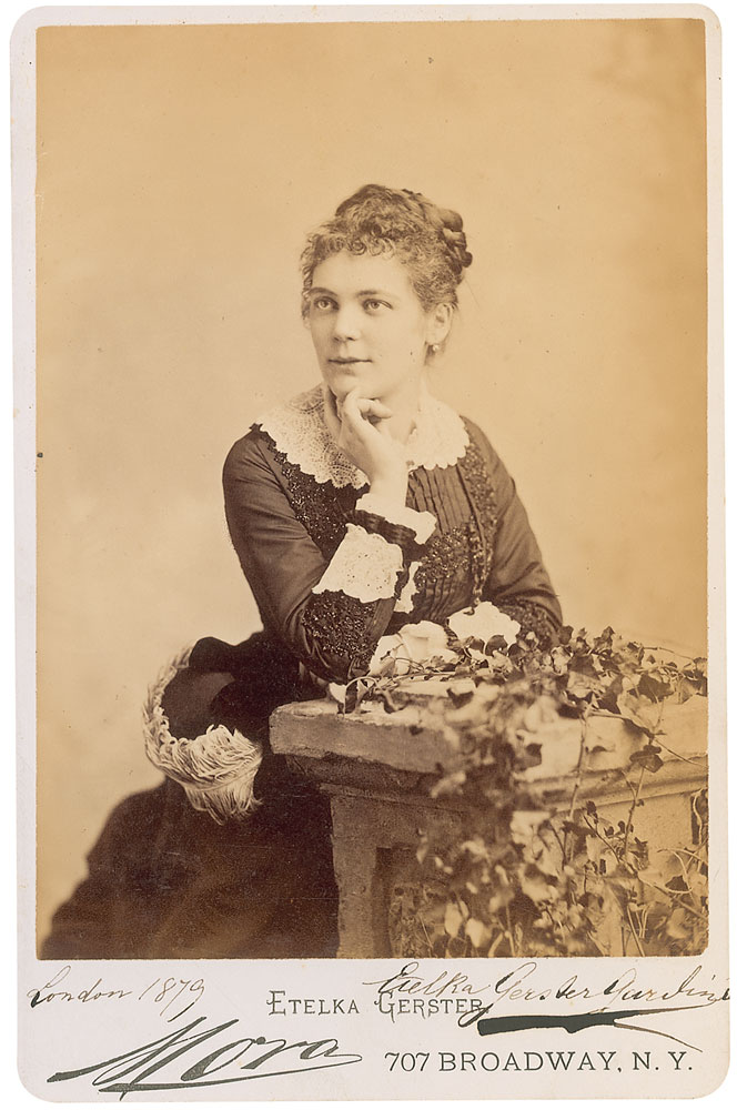 Hungarian soprano (1855–1920) who was considered one of the leading singers of her time. Original 4.25 x 6.5 cabinet photo by Mora of New York, signed in the lower border in black ink, “London 1879, Elka Gerster Gardini.” In fine condition, with some light surface marks to image and mounting remnants to reverse. RR Auction COA.