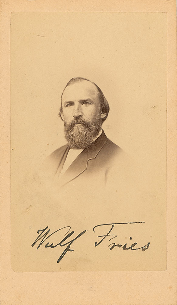 German-born American cellist. Original 2.5 x 4.25 carte-de-visite photo by A. Sonrel of Boston, signed at the bottom of the image in black ink, “Wulf Fries.” In fine condition, with just a bit of scattered light spotting to image, as well as some mild silvering. RR Auction COA.