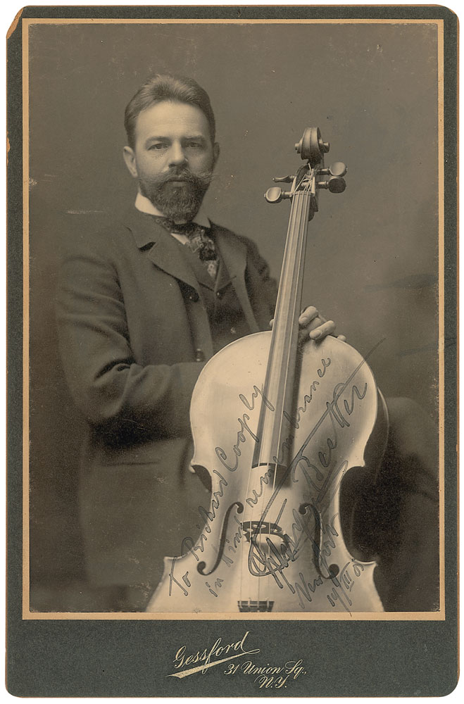 Prominent German cellist, cello teacher, and composer (1863–1941). Original 4.25 x 6.5 cabinet photo of Becker posing with his cello by Gessford of New York, signed and inscribed at the bottom of the image in black ink “To Richard Cooply, in remembrance, Hugo Becker, Newport, 19 III 01.” Some light contrast to portions of signature and inscription, some scattered light surface marks, and missing top left corner tip, otherwise fine condition. RR Auction COA.