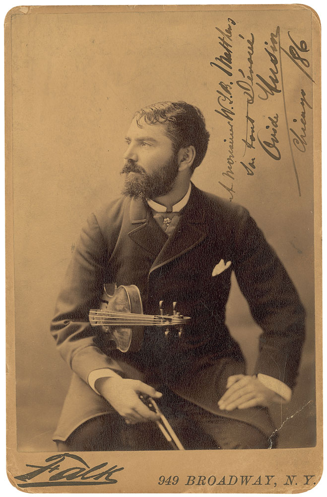 Belgian violin virtuoso and composer (1854–1929). Original 4.25 x 6.5 cabinet photo of Musin with his violin tucked under his arm by Falk of New York, signed and inscribed vertically in black ink in French and dated “Chicago /86.” In very good condition, with creasing to lower right, some light surface marks, scattered silvering to darker areas, and a few edge dings and creases. RR Auction COA.