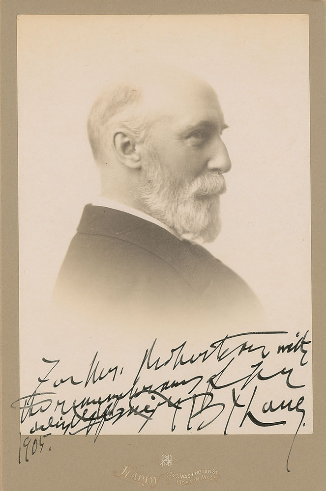 American conductor and pianist (1837–1909) who conducted the world premiere of Tchaikovsky’s Piano Concerto No. 1 in Boston. Original 4.25 x 6.5 cabinet profile photo, by Hardy Studios of Boston, hastily inscribed at the bottom of the image in black ink and signed “B. J. Lang, 1905.” In fine condition, with mounting remnants to reverse. RR Auction COA.