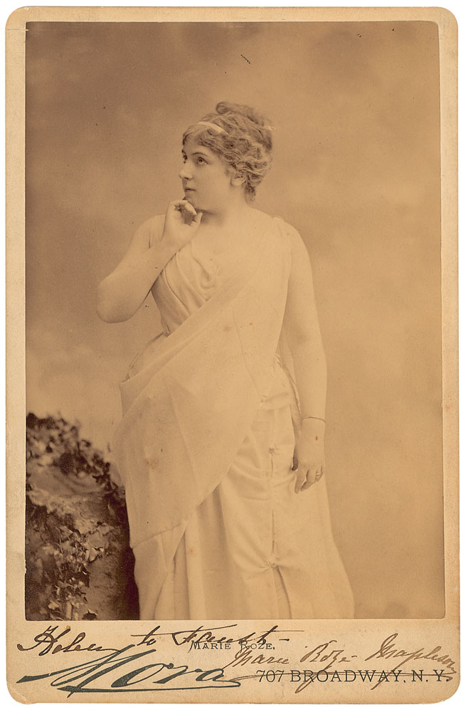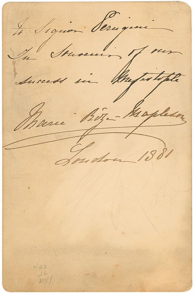 French operatic soprano (1846–1926) especially celebrated for her interpretation of the title role in Bizet's Carmen. Original 4.25 x 6.5 cabinet photo by Mora of New York, signed in the lower border in black ink, identifying her character as Helen from Faust. Also signed and inscribed on the reverse to a gentleman, and dated London, 1881. Light toning and soiling to the mount, slight silvering to dark areas of the image, and scattered marks and pencil notations to reverse, otherwise fine condition. RR Auction COA.