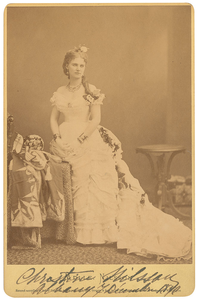 Well-regarded Swedish operatic soprano (1843–1921). Gorgeous original 6.5 x 4.25 cabinet photo of Nilsson in an extravagant gown by Gurney of New York, signed in the lower border in black ink, “Christine Nilsson, Albany, 7 December, 1870.” In fine condition, with mild toning to the borders and a few pencil notations to the reverse. RR Auction COA.