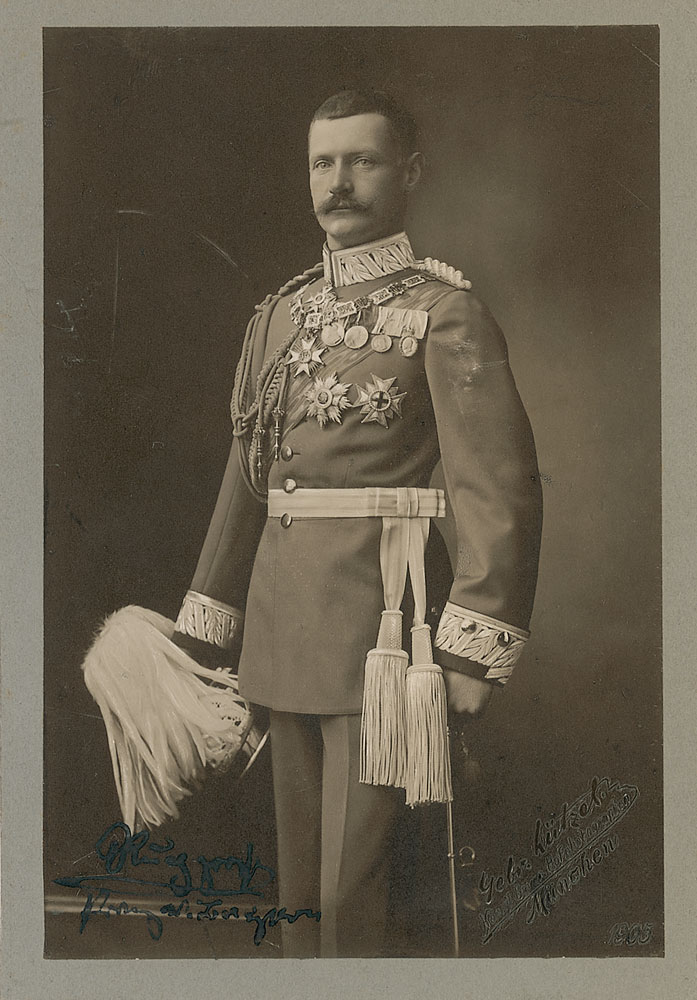 Last crown prince of Bavaria (1869–1955). Vintage matte-finish 3.5 x 5.5 photo of Rupert in full royal dress, signed in the lower left in black ink. Affixed to a slightly larger cardstock mount. A few surface marks and impressions, and light contrast to the signature, otherwise fine condition. RR Auction COA.