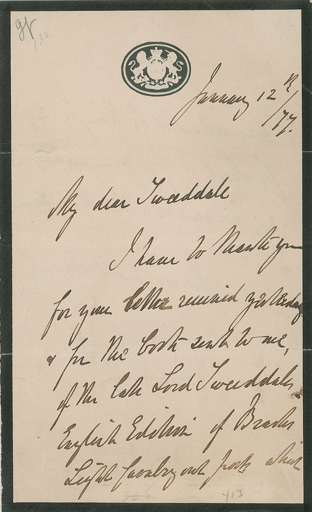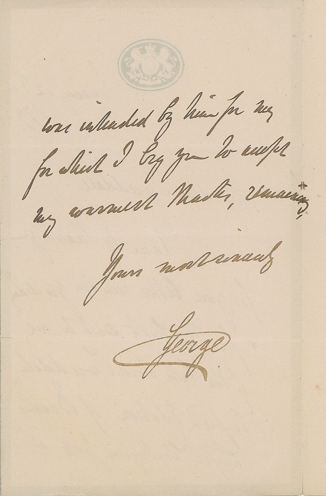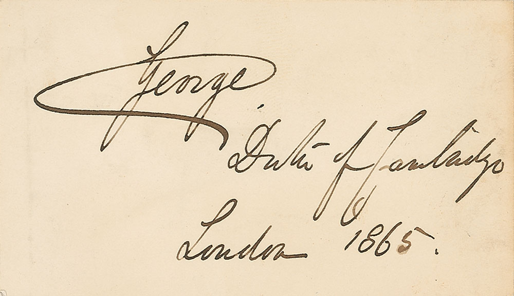 Grandson of King George III (1819–1904) who commanded the British Army from 1856 to 1895. Two items: one ALS signed “George,” one page both sides, 4.25 x 7.25, January 12, 1877, regarding a book; and one ink signature, “George, Duke of Cambridge, London, 1865.” In overall fine condition, with mild toning and soiling to both. RR Auction COA.