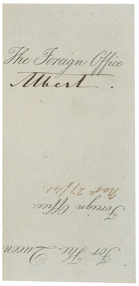Husband and Prince Consort to Queen Victoria (1819–1861). Vintage ink signature, “Albert,” on an off-white 2.75 x 6 slip clipped from a document. A few creases and various sacttered tack holes, otherwise fine condition. Accompanied by an unsigned original cabinet photo. RR Auction COA.