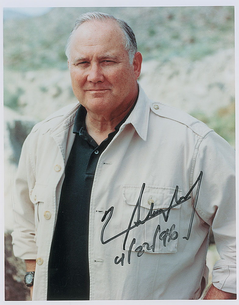Color glossy 8 x 10 photo of Schwarzkopf posing outdoors in civilian clothes, signed in black felt tip and dated April 22, 1996. In fine condition, with mild irregular adhesion to the signature. RR Auction COA.