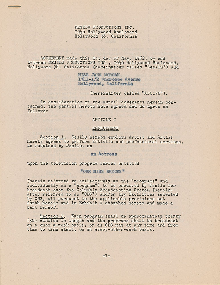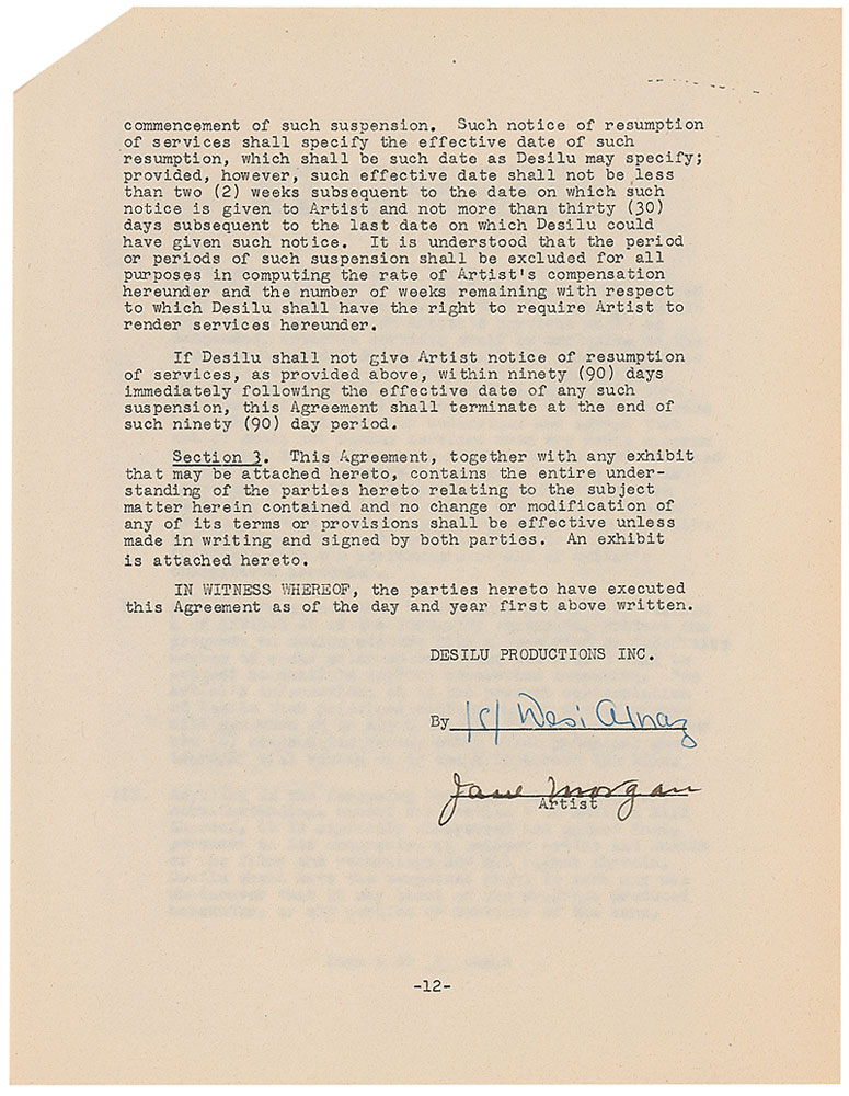 DS, twelve pages, 8.5 x 11, May 1, 1952. Agreement between Morgan and Desilu Productions for Morgan to render services as “an Actress upon the television program series entitled ‘Our Miss Brooks.’” A two-page onionskin rider is also stapled to the end of the document. In fine condition, with light overall toning. Pre-certified PSA/DNA and RR Auction COA.