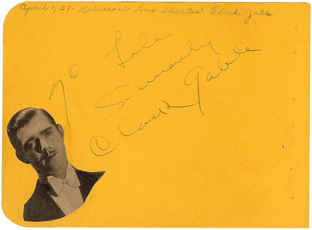 Very early vintage fountain pen signature and inscription, “To Lola, Sincerely, Clark Gable,” with a clipped photo of Gable affixed to left side on a gold 6 x 4.5 album page. Collector’s notation along top edge reads, “April 1, 37 Rehearsal Lux Theatre,” two years before the release of Gone With the Wind. Reverse bears a fountain pen signature and inscription of Paul Lukas, along with an affixed clipped photo. In fine condition. Pre-certified PSA/DNA and RR Auction COA.