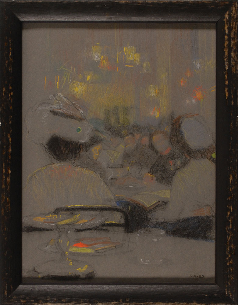 Artist who studied in Brno, at the Academe Julian in Paris, and under W. Thor in Munich. Original colored chalk and gouache artwork by Gustav Boehm, entitled ‘Cafe in Paris,’ on a gray 7.25 x 10 sheet, signed and dated in the lower right, “G. B. 09.” Framed to an overall size of 9 x 11.5. In fine condition, with a light crease to the lower left. Provenance: Sotheby’s. RR Auction COA.