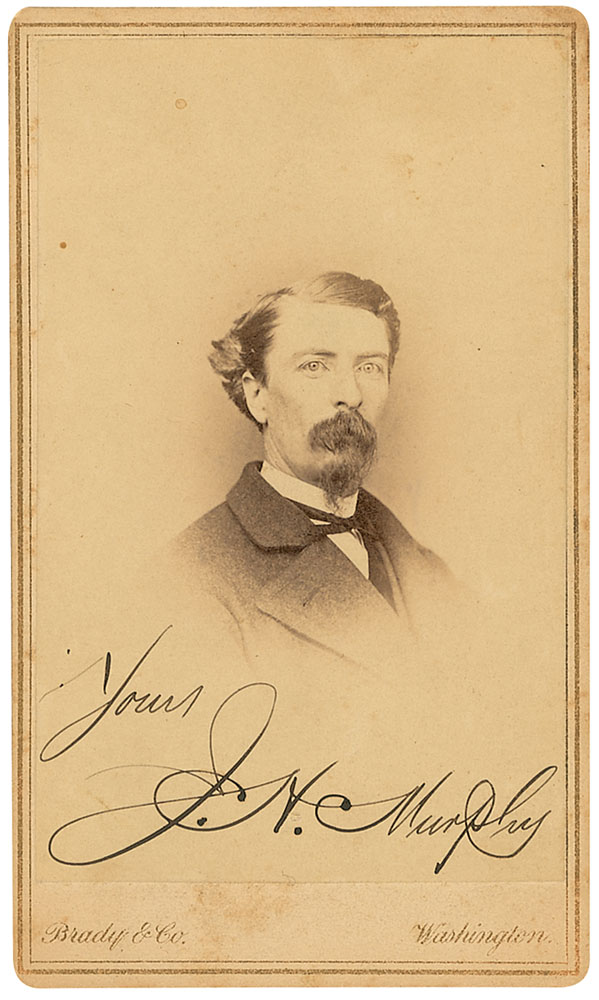 Iowa congressman (1835–1893) who served for two terms. Original 2.25 x 4 carte-de-visite photo by Brady of Washington, D. C., signed below the image in black ink, “Yours, J. H. Murphy.” A bit of scattered light toning and soiling to image and borders, otherwise fine condition. RR Auction COA.