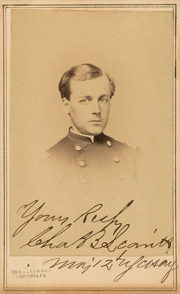 Union officer who served in the 12th USC Artillery. Original 2.25 x 4 carte-de-visite photo by Webster Brothers of Louisville, signed below the image in black ink, “Yours resp, Chas. B. Leavitt, Maj 12th U.S.C Arty.” Toning to bottom edge, light surface loss to reverse, as well as an affixed revenue stamp, otherwise fine condition. RR Auction COA.