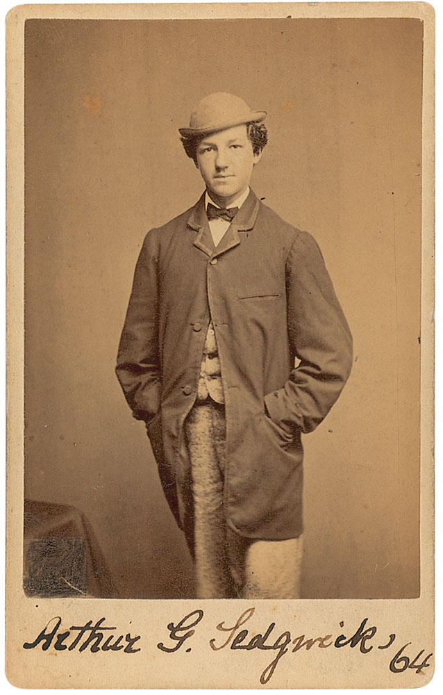 Lawyer, author, and editor (1844–1915). He served as an officer in the 20th Massachusetts, and spent time in Libby Prison. He later became the editor of the American Law Review with Oliver Wendell Holmes, Jr. Original 2.5 x 4 carte-de-visite photo of Sedgwick in civilian clothes by Whipple of Boston, signed in the lower border in black ink, “Arthur G. Sedgwick ‘64.” In fine condition, with scattered light surface marks and a small area of surface touch-up to lower left. RR Auction COA.