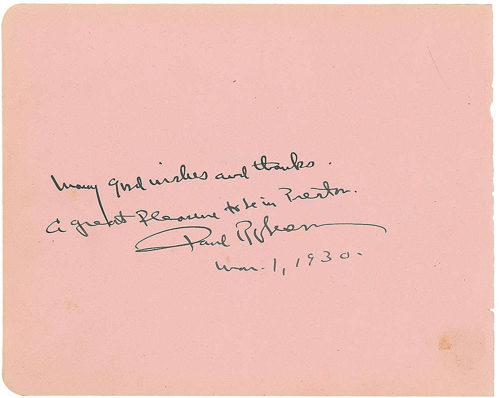 Vintage fountain pen signature, “Many good wishes and thanks. A great pleasure to be in Preston. Paul Robeson, Mar. 1, 1930,” on a light pink 7.5 x 6 album page. Mild toning to borders and light scattered creases and soiling, otherwise fine condition. Pre-certified PSA/DNA and RR Auction COA.