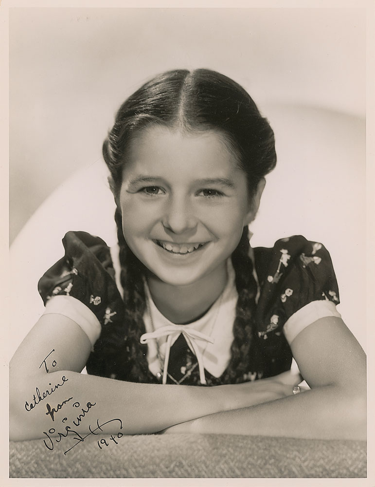 Uncommon adorable oversized vintage pearl-finish 10 x 13 double weight MGM publicity photo of Weidler as a child, signed and inscribed in fountain pen “To Catherine from Virginia 1940.” In fine condition. Pre-certified PSA/DNA and RR Auction COA.