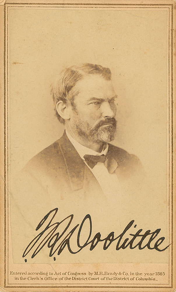 Politician from Wisconsin (1818–1897) and a staunch supporter of Lincoln’s during the Civil War. Original 2.25 x 4 carte-de-visite photo by Brady, boldly signed below the image in black ink, “J. R. Doolittle.” A light diagonal crease through beginning of signature, a couple corner tip creases and some scattered light toning, otherwise fine condition. RR Auction COA.