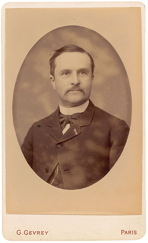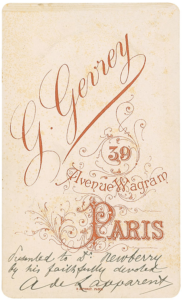 French geologist (1839–1908). Original 2.5 x 4 carte-de-visite portrait by G. Gevrey of Paris, signed and inscribed to a fellow geologist on the reverse in black ink, “Presented to Dr. Newberry by his faithfully devoted A. de Lapparent.” In fine condition, with mild scattered foxing to reverse. RR Auction COA.