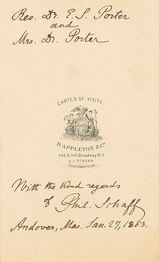 Protestant theologian and a Church historian (1819–1893). Original 2.5 x 4 carte-de-visite bust portrait by D. Appleton & Co. of New York, signed and inscribed on the reverse in black ink, “Rev. Dr. E. S. Porter, With the kind regards of Phil. Schaff, Andover, Mas., Jan. 27, 1863.” In fine condition. RR Auction COA.