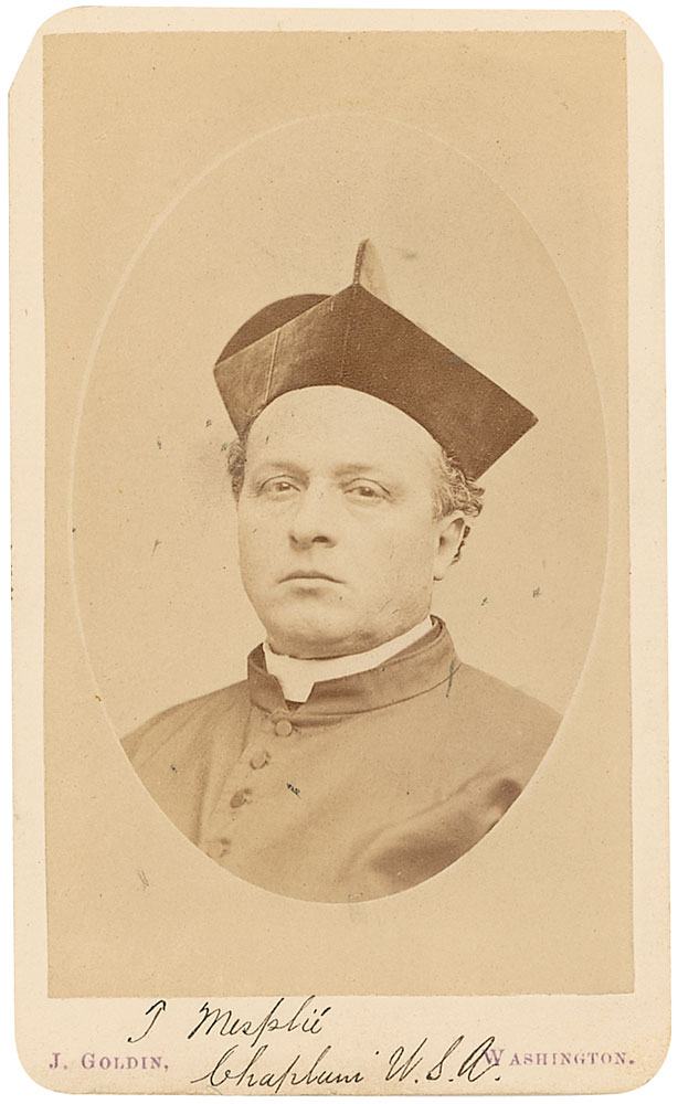 Clergyman and missionary who worked with Native Americans. Original 2.5 x 4 carte-de-visite portrait by J. Goldin of Washington, signed in the lower border in black ink, “T. Mesplie, Chaplain U. S. A.” Light scattered surface marks and clipped corners, otherwise fine condition. RR Auction COA.