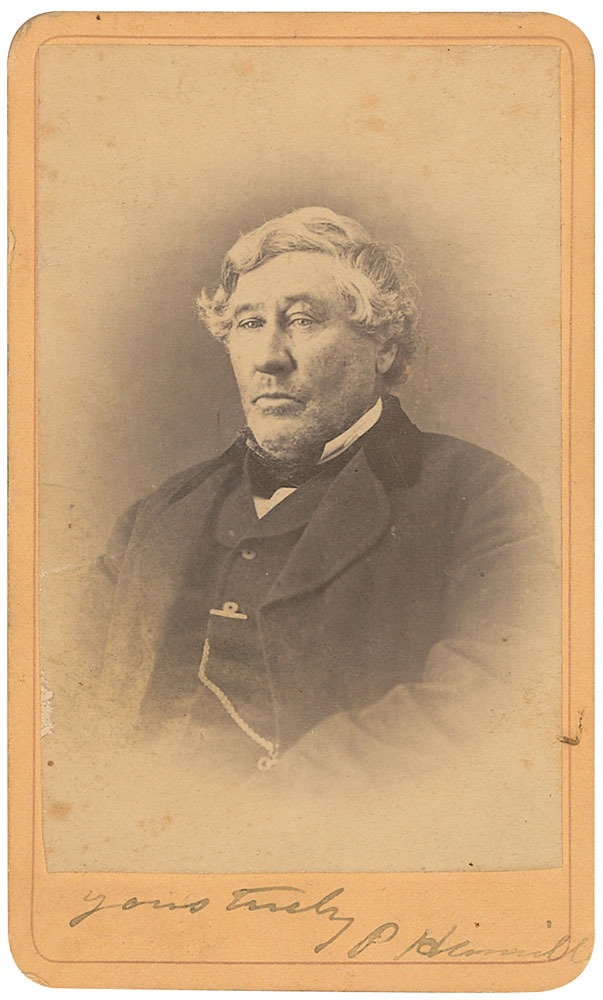 Politician (1817–1895) who served as congressman from Maryland from 1869 to 1871. Original 2.5 x 4 carte-de-visite portrait by an anonymous studio, signed in the lower border in black ink, “Yours truly, P. Hamill.” Scattered wrinkles and light foxing to the image, otherwise fine condition. RR Auction COA.