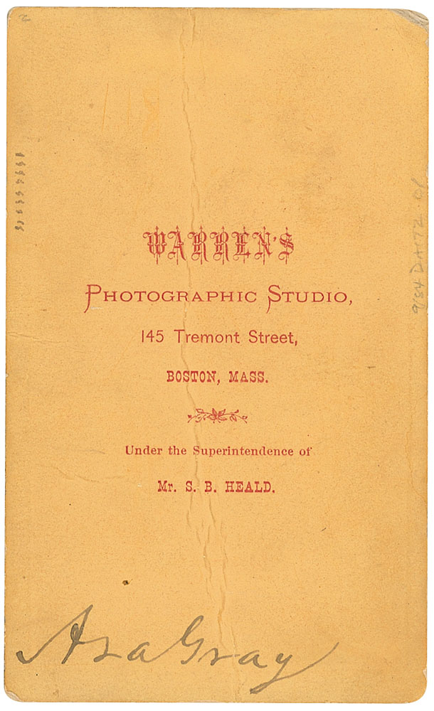 The most important American botanist of the 19th century (1810–1888). Original 2.25 x 4 carte-de-visite photo by Warren’s of Boston, signed on the reverse in black ink. Creasing and mild rippling to image and a central vertical crease to reverse through a single letter of signature, otherwise fine condition. RR Auction COA.