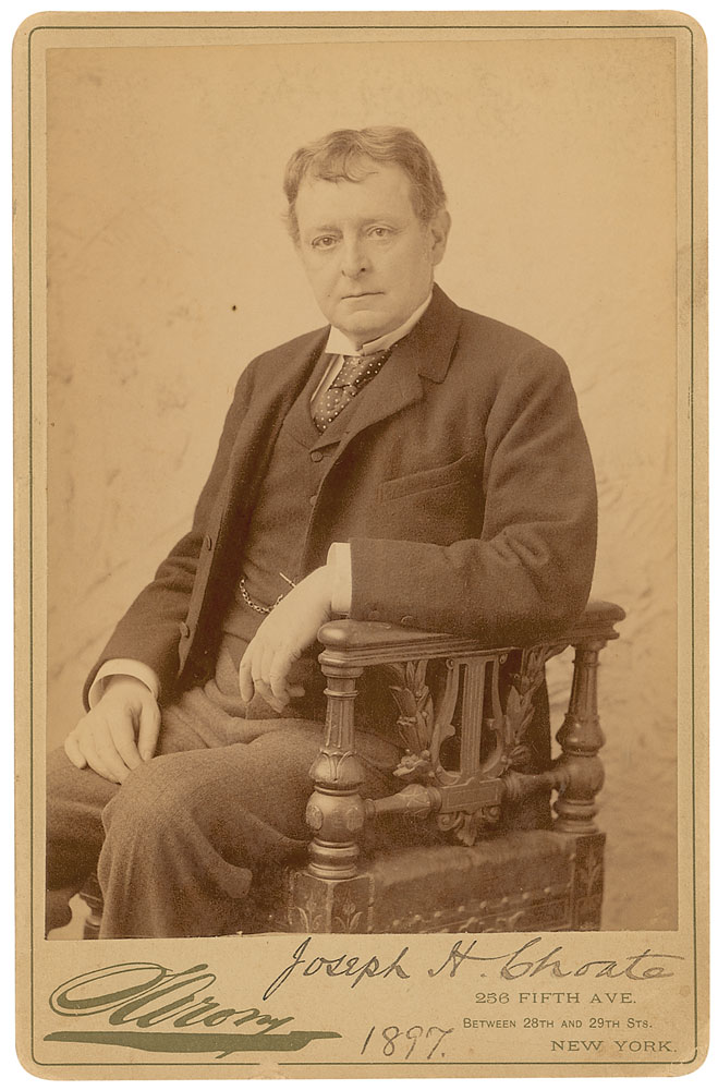 American lawyer and diplomat (1832–1917). Original 4.25 x 6.5 cabinet photo by Sarony of New York, signed in the lower border in black ink, “Joseph H. Choate.” Scattered surface spotting and dings to edges, otherwise fine condition. RR Auction COA.
