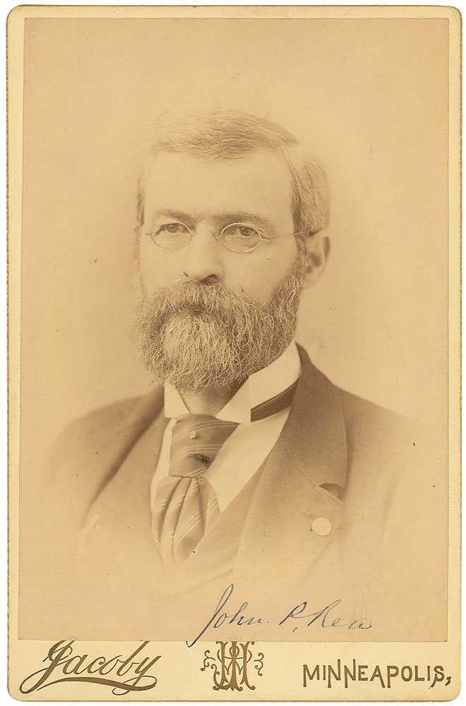 Judge, editor of the Minneapolis Tribune, and commander in chief of the Grand Army of the Republic (1840–1900). Original 4.25 x 6.5 cabinet photo by Jacoby of Minneapolis, signed at the bottom of the image in black ink, “John P. Rea.” In fine condition, with a few light surface marks, slight brush to the end of the signature, and a few pencil notations to reverse. RR Auction COA.