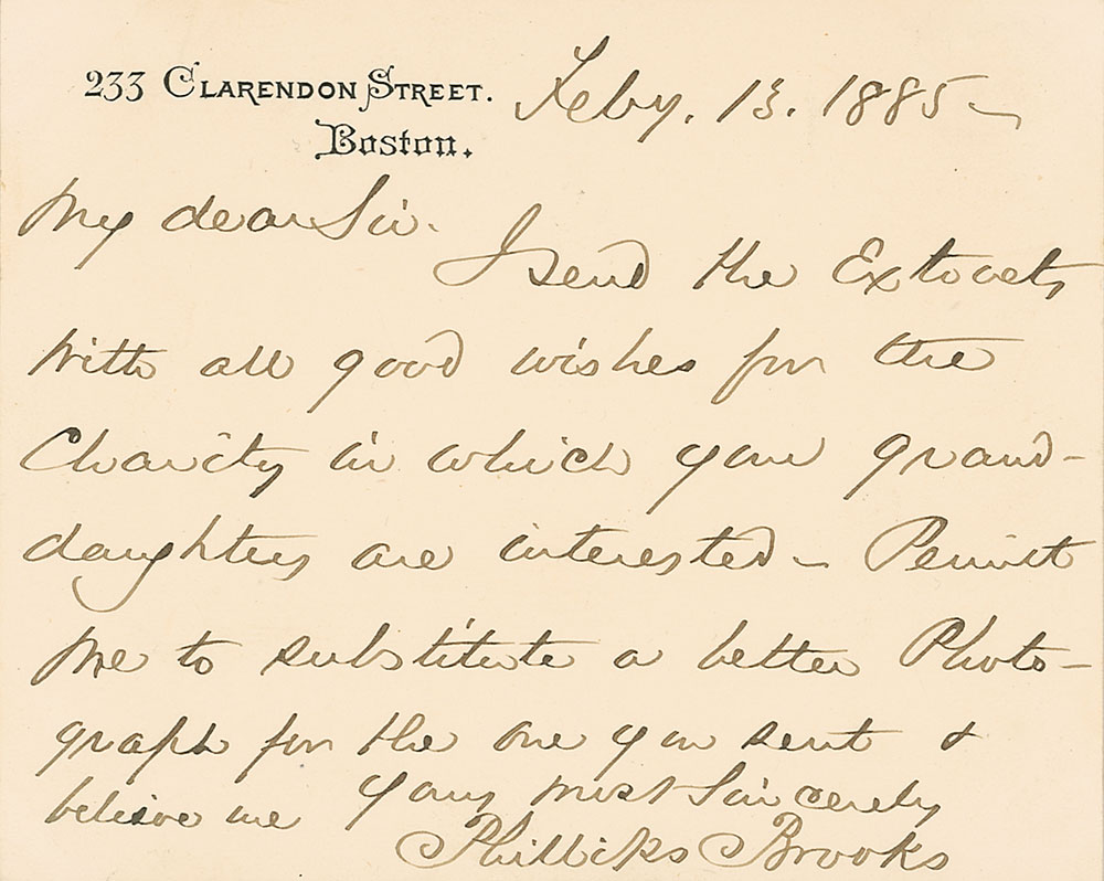 ALS, one page, 4.5 x 3.5, personal letterhead, February 13, 1885. Letter to a gentleman. In full: “I send you the Extracts with all good wishes for the Charity in which your granddaughters are interested—Permit me to substitute a better Photograph for the one you sent.” In very fine condition. Accompanied by an unsigned original cabinet photo of Brooks. RR Auction COA.