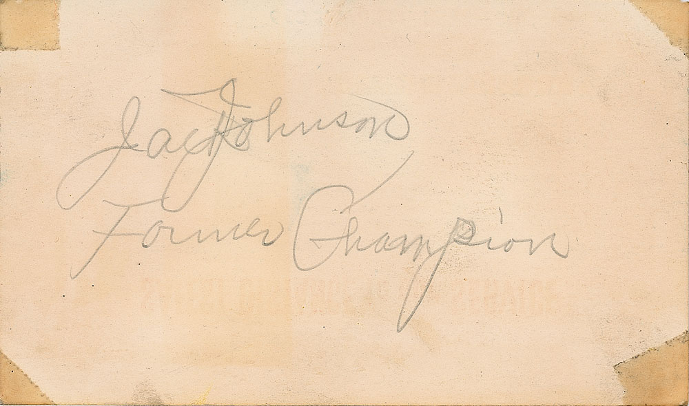 Scarce and desirable vintage pencil signature, “Jack Johnson, Former Champion,” on the reverse of a 5.5 x 3.25 automobile maintenance card. In very good condition, with light scattered toning and toned tape remnants to corners. Pre-certified Steve Grad/PSA/DNA and RR Auction COA.