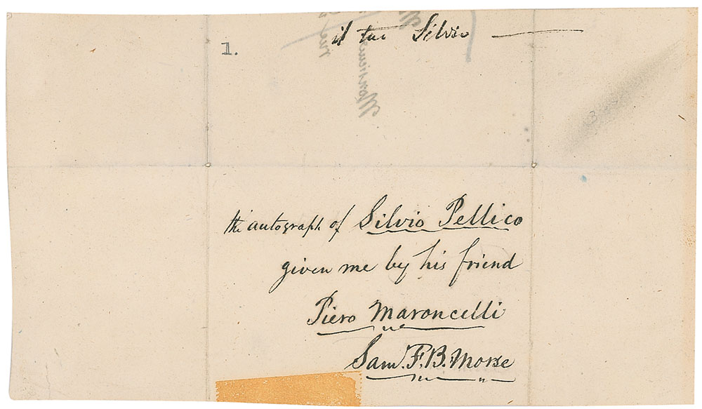 American artist and inventor (1791–1872) whose development of the telegraph revolutionized communication—and indeed, society as a whole—and represented a crucial step toward such later innovations as the telephone. Ink signature, “The autograph of Silvio Pellico, given me by his friend Piero Maroncelli, Sam. F. B. Morse,” on an off-white 6.5 x 3.75 slip, affixed to a same-size cardstock sheet. Intersecting folds and a toned piece of tape affixed to the lower border, otherwise fine condition. Accompanied by an unsigned carte-de-visite portrait of Morse. RR Auction COA.