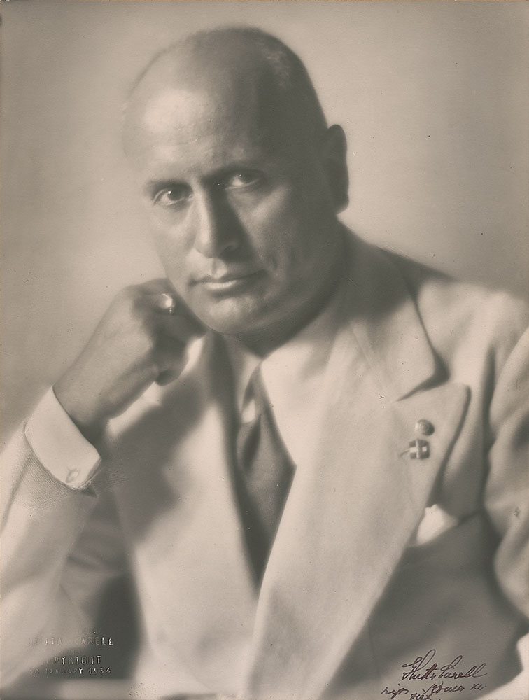 Carell (1899–1972) was a Hungarian-born photographer who settled in Italy in the 1920s, and gained international renown in the realm of portrait photography. Original matte-finish 6.5 x 8.75 silver print portrait of Mussolini, blindstamped in the lower left with a 1934 copyright date by the photographer Ghitta Carell, and signed by Carell in black ink in the lower right. Affixed to a slightly larger mount. In fine condition, with irregularly trimmed edges to the mount. RR Auction COA.