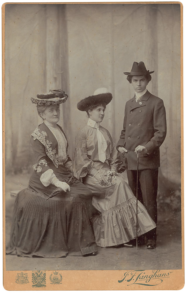 Enormously popular Czech-born violin virtuoso (1880–1940). Uncommon oversized 5.25 x 8.5 boudoir cabinet photo of Kubelik posing with two women, most likely his new wife Countess Czaky Szell and perhaps her mother by J. F. Langhans, blindstamped in the lower right “1903.” Some light spotting to image, ding to lower right corner tip, and a few surface marks, otherwise fine condition. RR Auction COA.